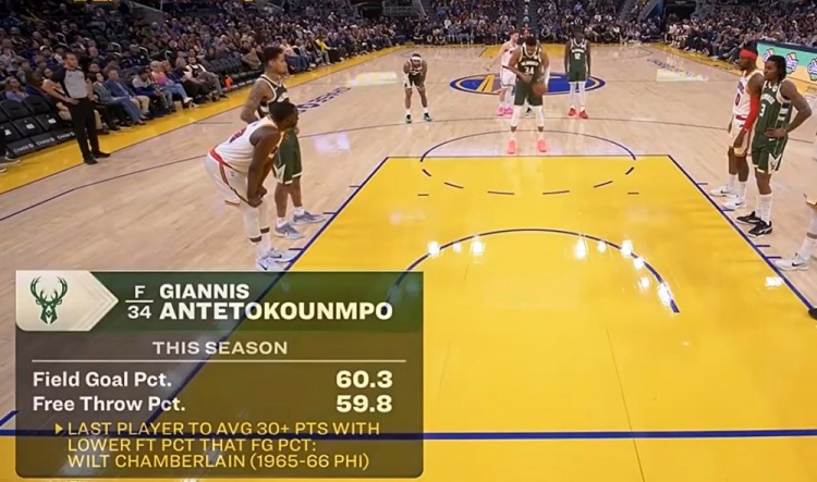 比賽中轉(zhuǎn)播方給出一組數(shù)據(jù),字母哥本賽季投籃命中率60.3%,罰球命中率59.8%。