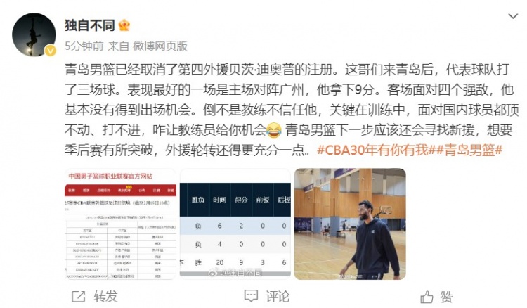 3月19日訊 今天,青島男籃記者杜金城在社媒上談到了球隊取消迪奧普注冊一事。