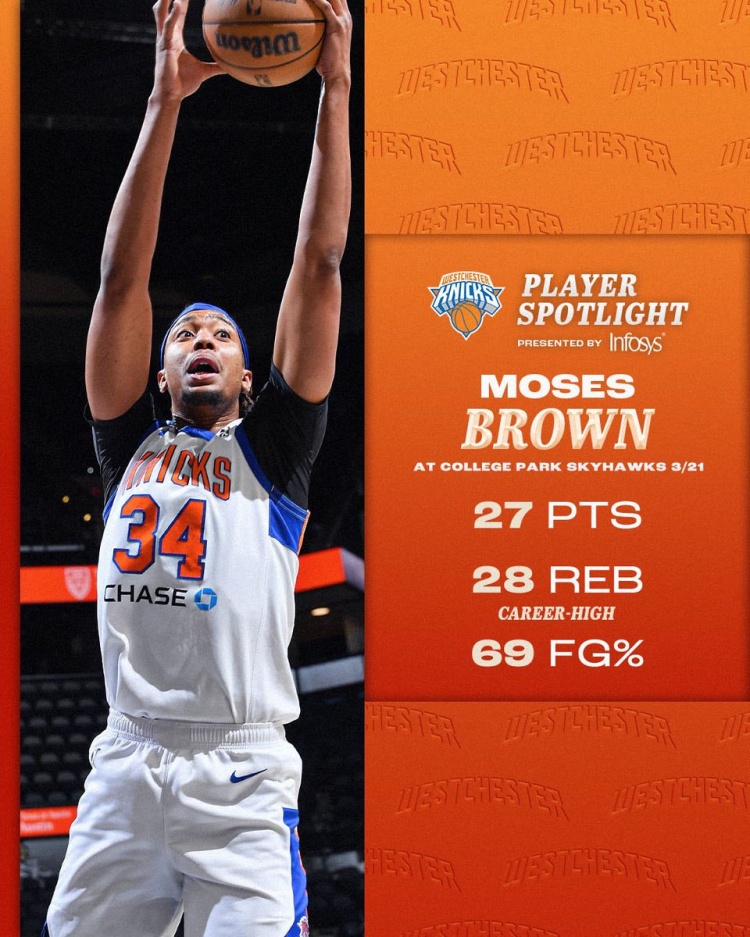 韋斯特徹斯特尼克斯中鋒摩西-布朗此役打出精彩表現(xiàn),出戰(zhàn)37分鐘,13投9中,12罰7中,砍下27分28籃板。