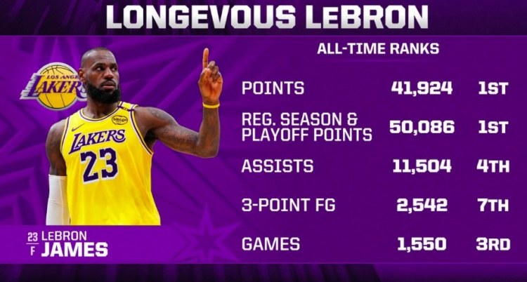 老詹41924分歷史第一;常規(guī)賽+季后賽50086分第一;總助攻11504第4;總?cè)置?542個(gè)歷史第7;出戰(zhàn)1550場(chǎng)歷史第3