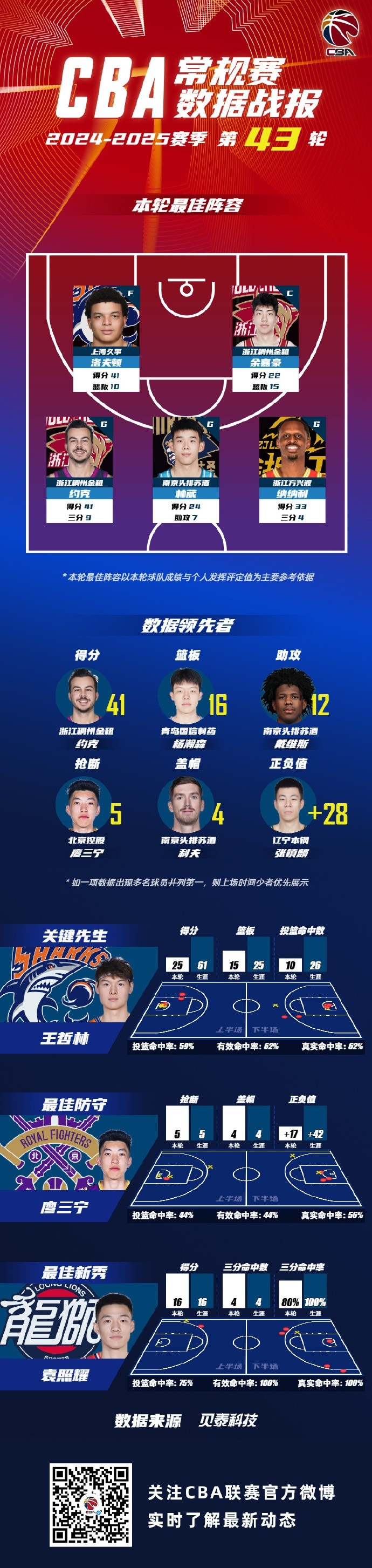 數(shù)據(jù)領先者方面:浙江稠州金租球員約克以單場41分的數(shù)據(jù)領銜得分榜;