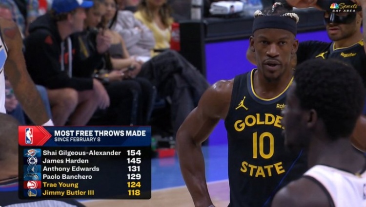 截止日以來(lái)罰球總數(shù)Top6:亞歷山大154次力壓哈登 巴特勒第六