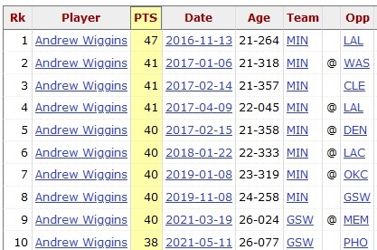 至此,維金斯生涯單場(chǎng)得分前十全部邁入40+,有8次在森林狼獲得、1次勇士、1次熱火。