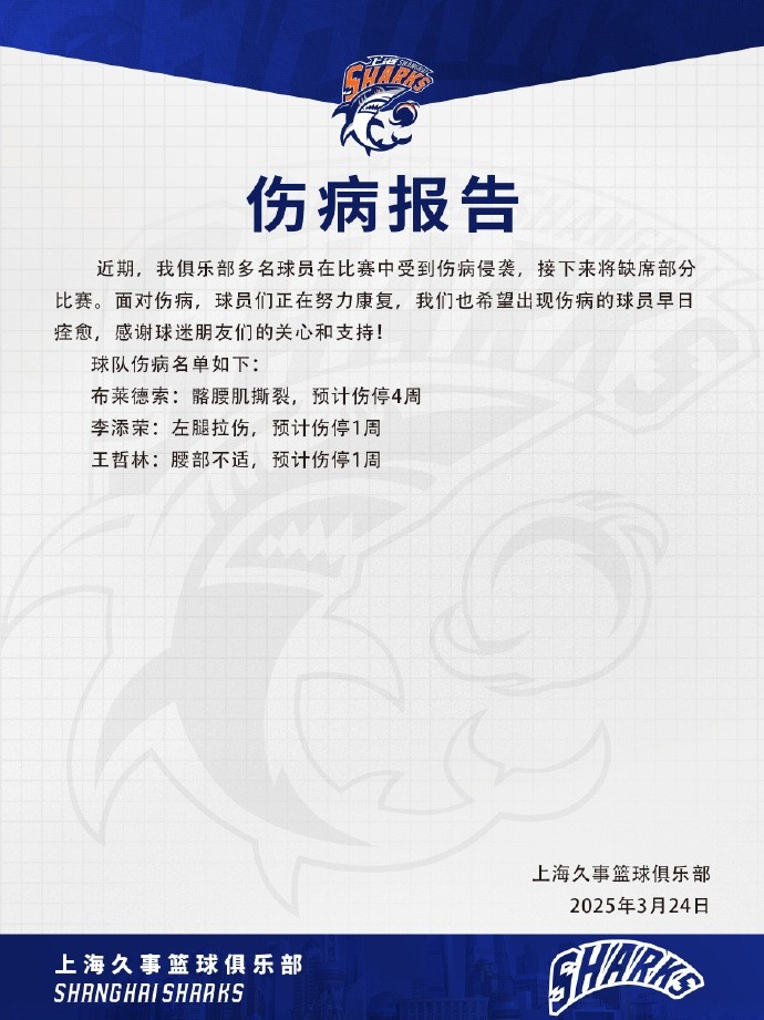 3月24日訊 今天,上海男籃發(fā)布了球隊的傷病報告。
