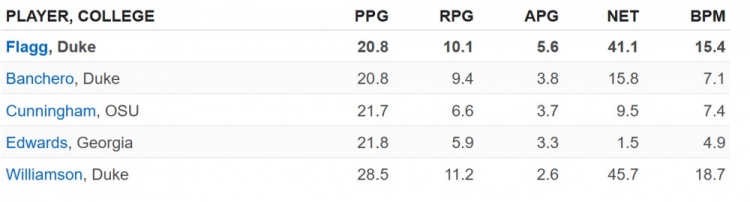 雖然即戰(zhàn)力和發(fā)展?jié)摿κ遣煌木S度,但弗拉格在大學(xué)賽場(chǎng)的統(tǒng)治表現(xiàn)同時(shí)通過(guò)了數(shù)據(jù)驗(yàn)證與球探肉眼觀察的雙重檢驗(yàn),尤其是當(dāng)將他與NBA球星進(jìn)行類(lèi)比時(shí)。