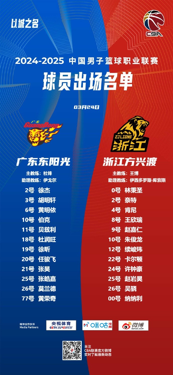 廣東隊(duì):徐杰、胡明軒、黃明依、伯克、貝茲利、杜潤旺、徐昕、任駿飛、張昊、張皓嘉、莫蘭德、黃榮奇。
