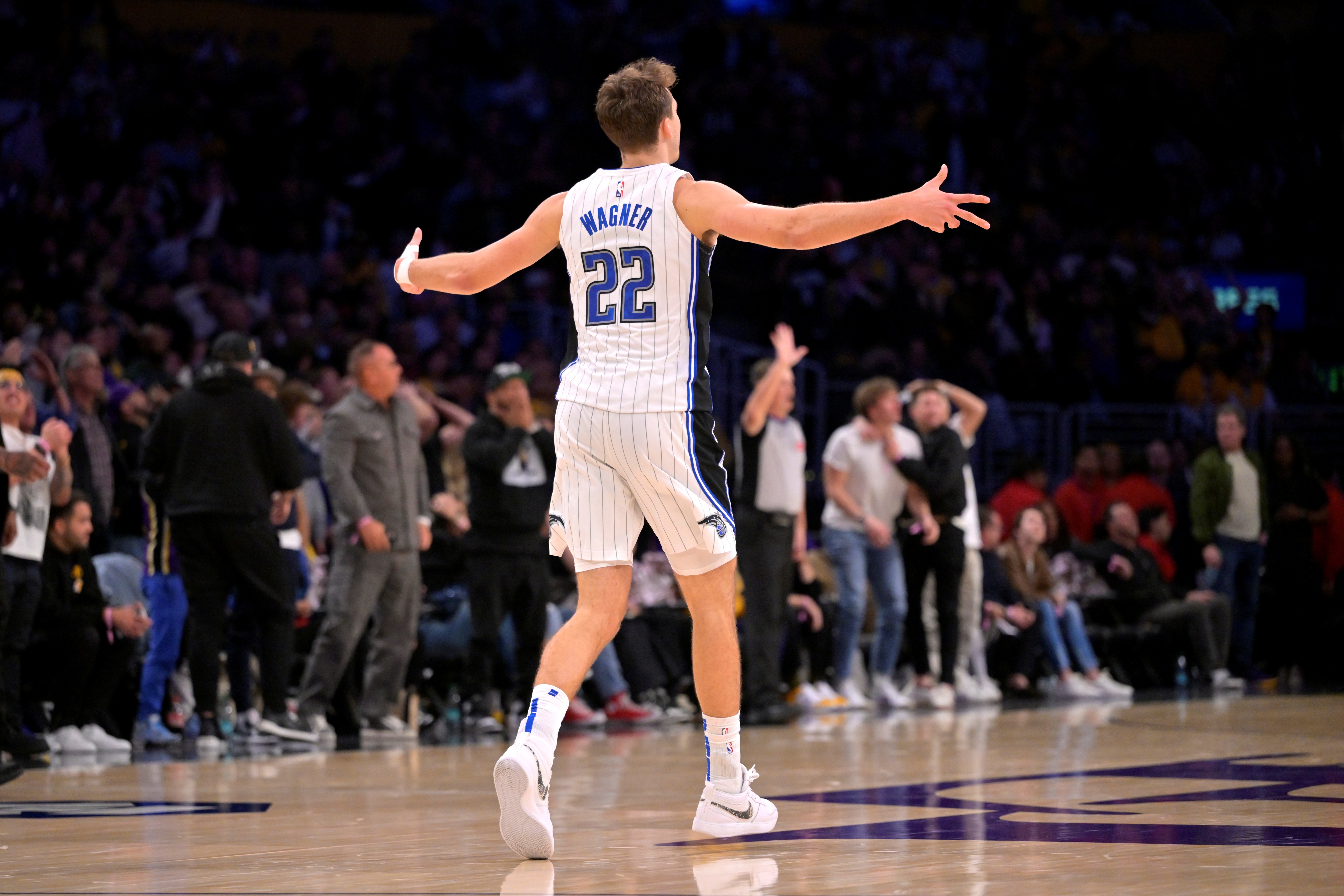 雷迪克教練及時挑戰(zhàn)了防守策略,不敢再任由小瓦格納和班凱羅點菜湖人小后衛(wèi),防擋拆點名采用了大延誤返位,小瓦格納和班凱羅接球后再上邊角夾擊返位,撲空位三分球——輪轉(zhuǎn)速率拉滿,盡可能逼魔術(shù)雙核在威脅禁區(qū)時出球,考驗?zāi)g(shù)非重點人的邊角三分抽獎準(zhǔn)度。