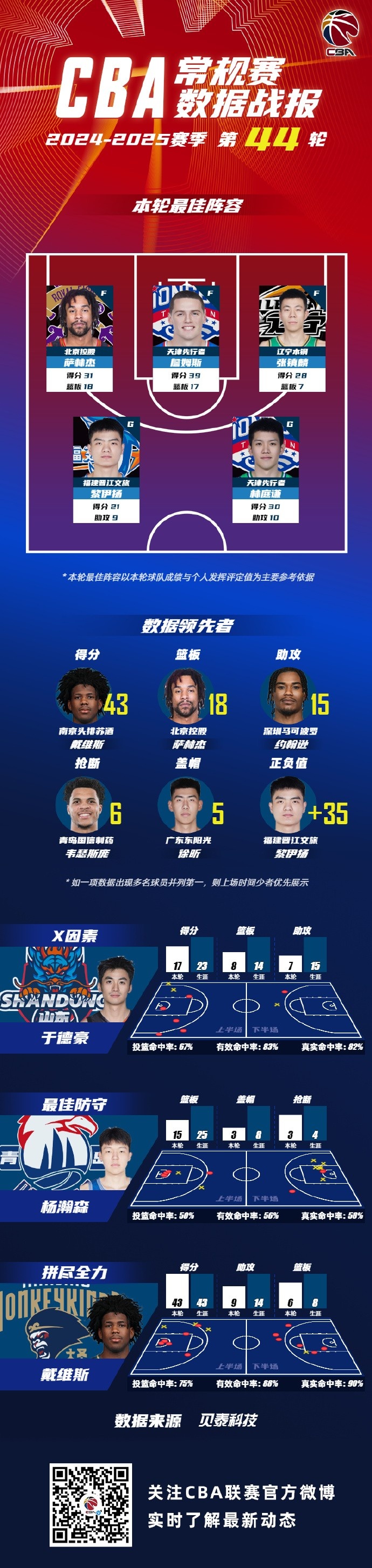 2024-2025賽季CBA聯(lián)賽常規(guī)賽第44輪結(jié)束較量,來自北京控股籃球俱樂部的薩林杰,天津榮鋼籃球俱樂部的詹姆斯和林庭謙 ,遼寧沈陽三生飛豹籃球俱樂部的張鎮(zhèn)麟和福建潯興SBS男籃的黎伊揚入選CBA聯(lián)賽常規(guī)賽第44輪最佳陣容!
