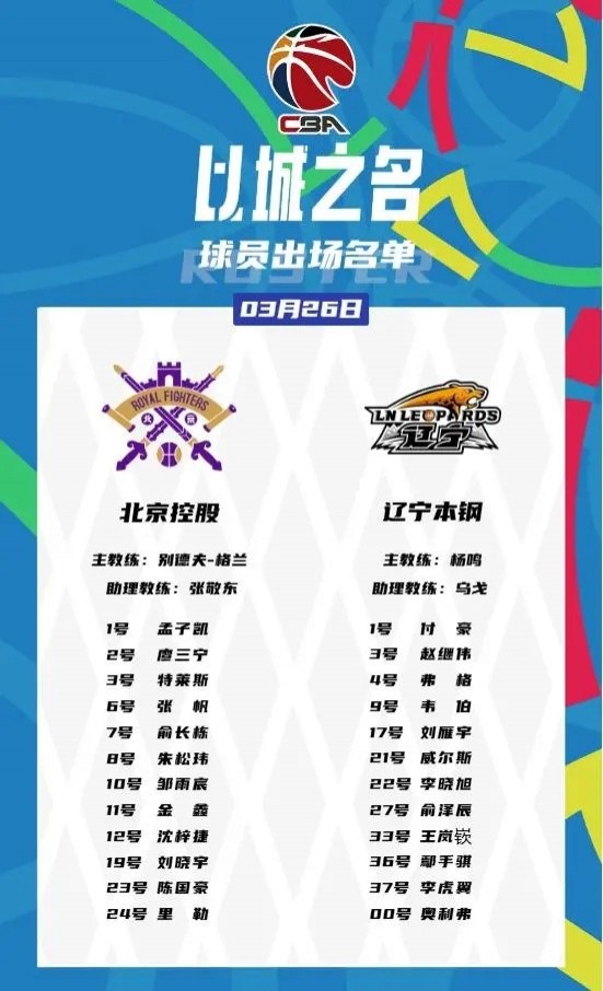 北控:孟子凱、廖三寧、特萊斯、張帆、俞長棟、朱松瑋、鄒雨宸、金鑫、沈梓捷、劉曉宇、陳國豪、里勒。