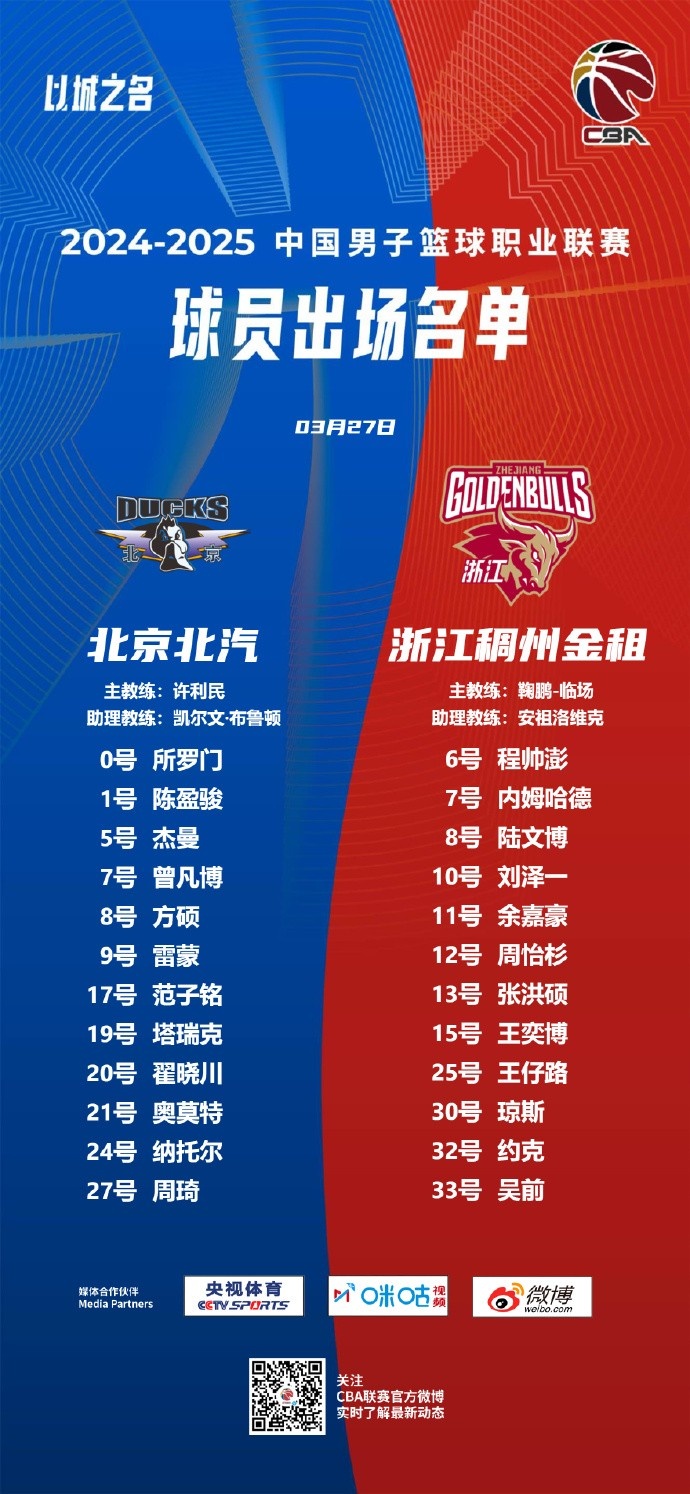 3月27日訊 今晚7點35分,北京男籃將在主場迎戰(zhàn)浙江男籃。