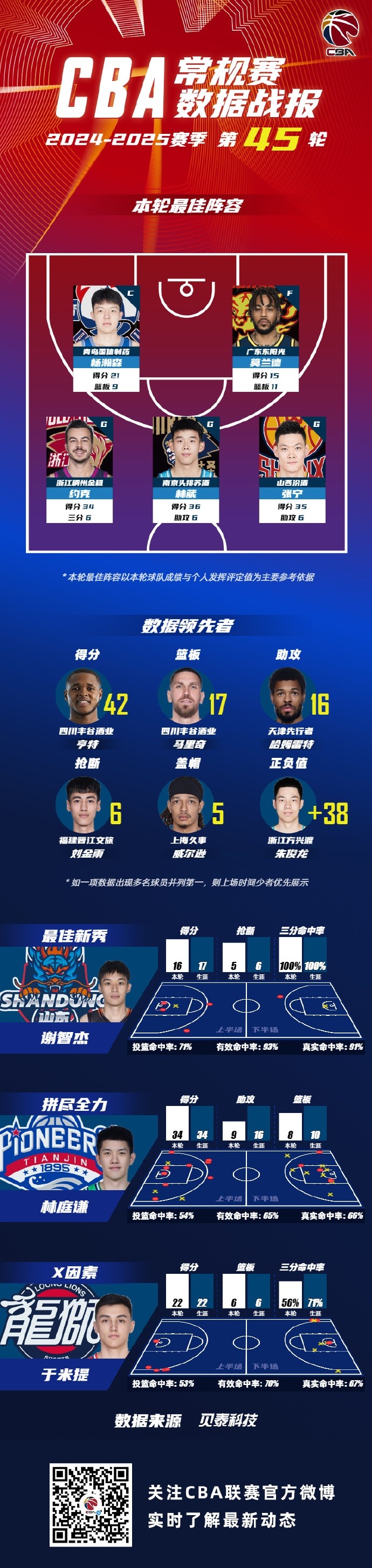 2024-2025賽季CBA聯(lián)賽常規(guī)賽第45輪結(jié)束較量,來自青島國信海天籃球俱樂部的楊瀚森,廣東宏遠籃球俱樂部的莫蘭德,浙江稠州籃球俱樂部的約克, 南京同曦籃球俱樂部的林葳和山西汾酒職業(yè)籃球俱樂部的張寧入選CBA聯(lián)賽常規(guī)賽第45輪最佳陣容!