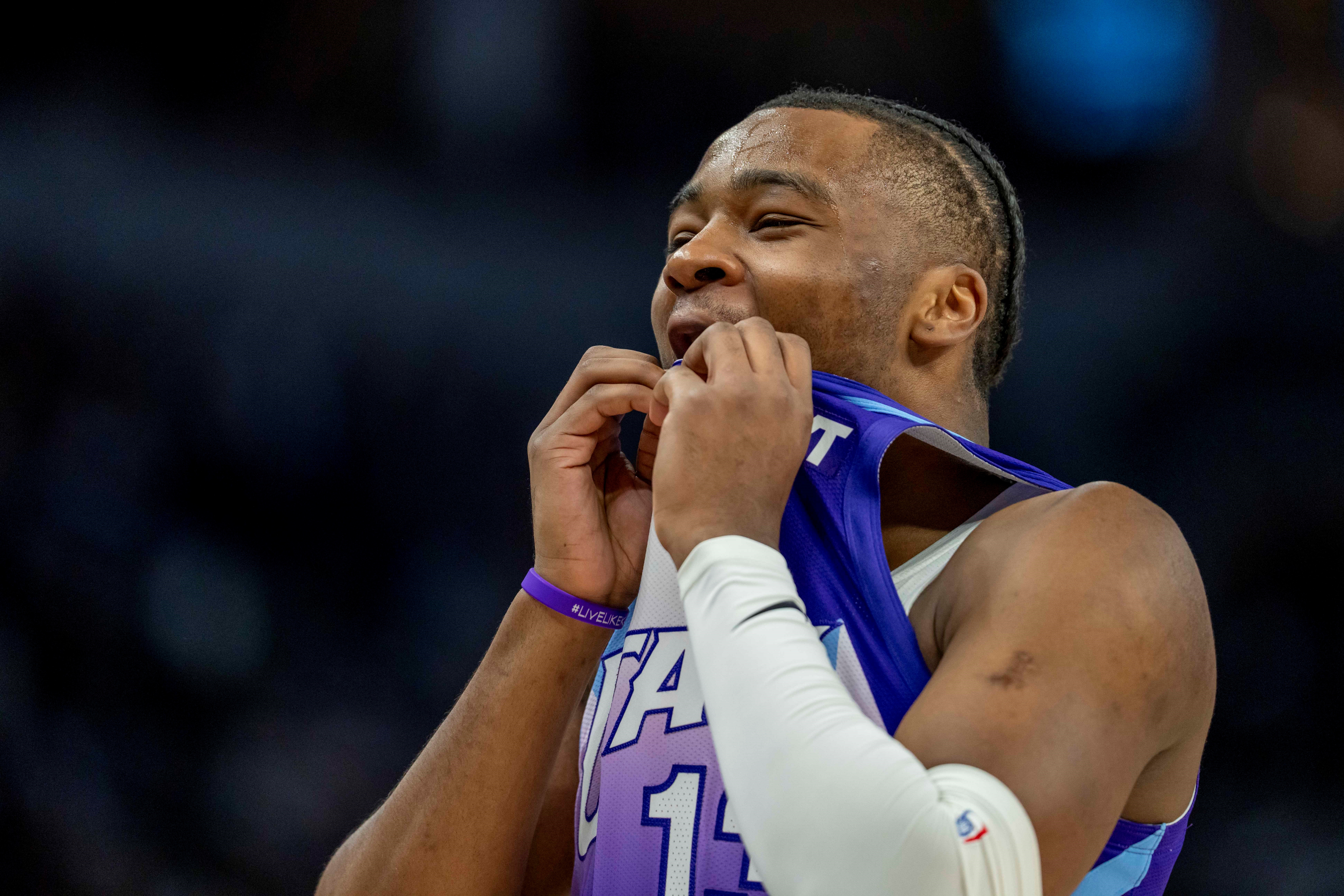 爵士新秀科利爾本場(chǎng)比賽雖然在組織上表現(xiàn)還行,但進(jìn)攻端手感全無(wú),運(yùn)動(dòng)戰(zhàn)出手全部打鐵,最后垃圾時(shí)間才靠罰球拿分。