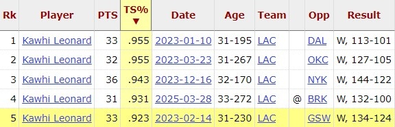 值得一提的是,小卡本場(chǎng)真實(shí)命中率高達(dá)93.1%,在小卡生涯152場(chǎng)30+比賽中,本場(chǎng)是第4高效的。