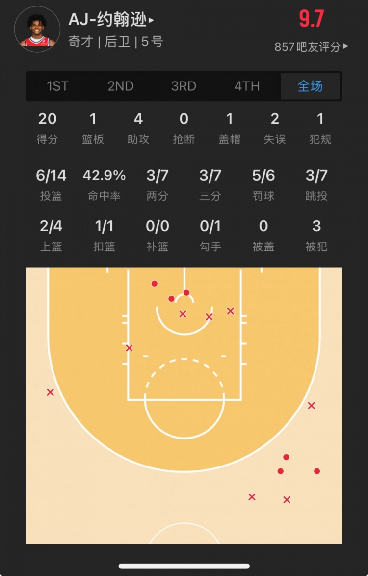 奇才23號(hào)秀 AJ-約翰遜 登場(chǎng)42.3分鐘