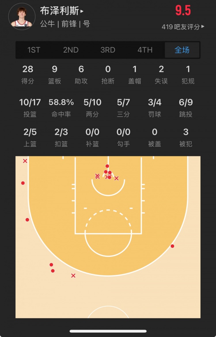 公牛11號(hào)秀 馬蒂斯-布澤利斯 登場(chǎng)37.6分鐘