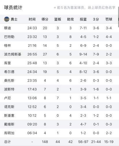 全員發(fā)揮!勇士出戰(zhàn)13人全部都有得分入賬 庫追巴只出戰(zhàn)3節(jié)
