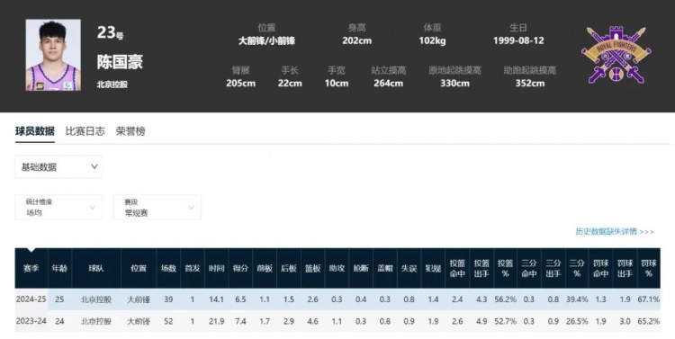 陳國(guó)豪今年效率還行,但出場(chǎng)機(jī)會(huì)被薩林杰+沈梓捷進(jìn)一步擠壓
