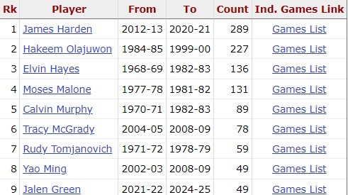 據(jù)統(tǒng)計,這是杰倫-格林生涯第50場比賽30+,超越姚明,獨享隊史第8位。