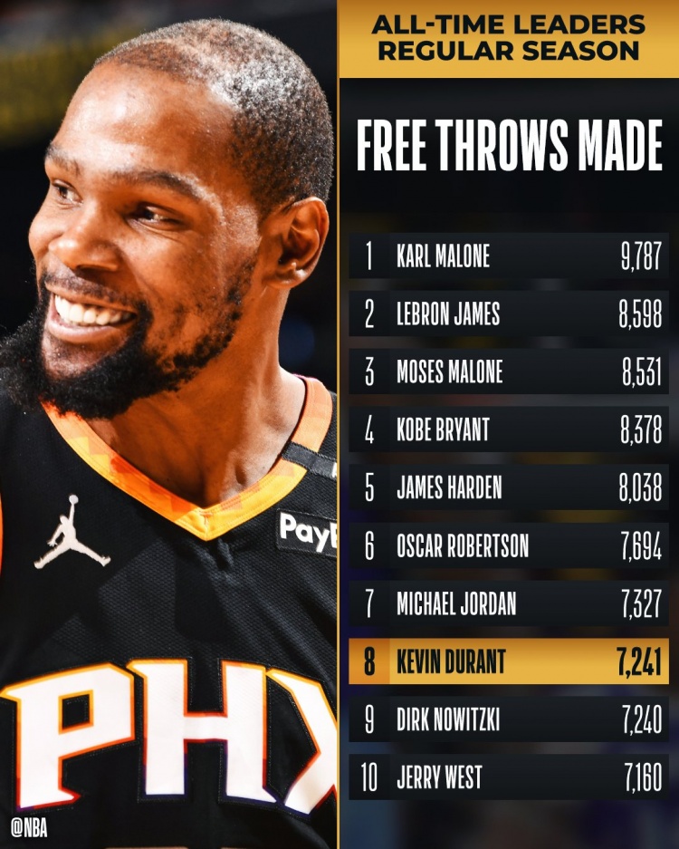?KD常規(guī)賽罰球命中數(shù)達到7241次 超越諾維茨基升至歷史第8!
