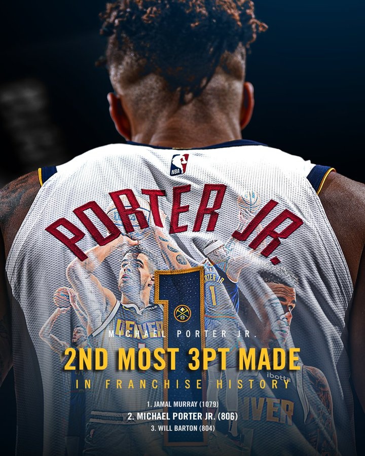 波特掘金生涯三分命中數(shù)來到806記 超越巴頓 升至隊史第2位