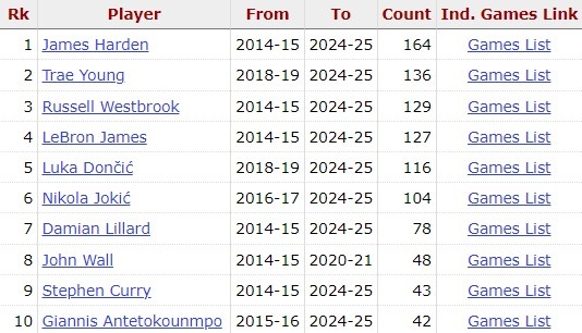 哈登過(guò)去10年里165場(chǎng)比賽至少25分10助 同期所有球員中最多