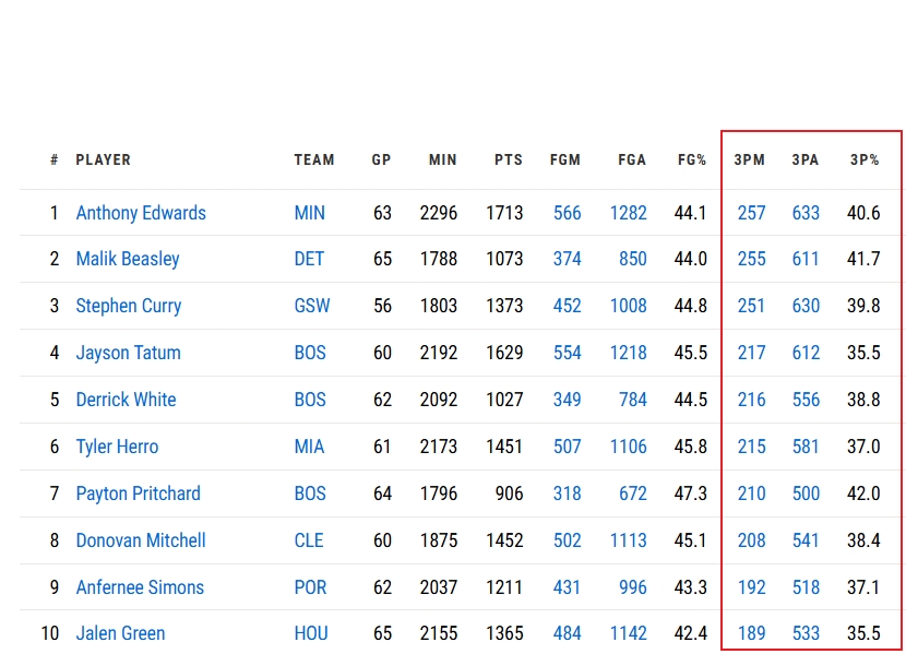 聯(lián)盟三分榜前10:愛德華茲比斯利前2 庫里和第一僅差6記三分!