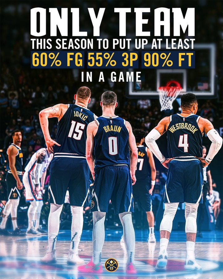 據(jù)統(tǒng)計(jì),掘金是本賽季首支球隊(duì)在一場(chǎng)比賽中打出60-55-90%的命中率。而且掘金打的是聯(lián)盟第一防守的雷霆。