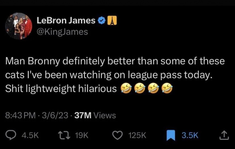 在2023年3月6日,詹姆斯發(fā)推寫道:“天啊,布朗尼絕對強于今天我在聯(lián)盟通(注:NBA官方比賽直播服務)上看到的一些阿貓阿狗。這場面真的有點好笑????????????????”