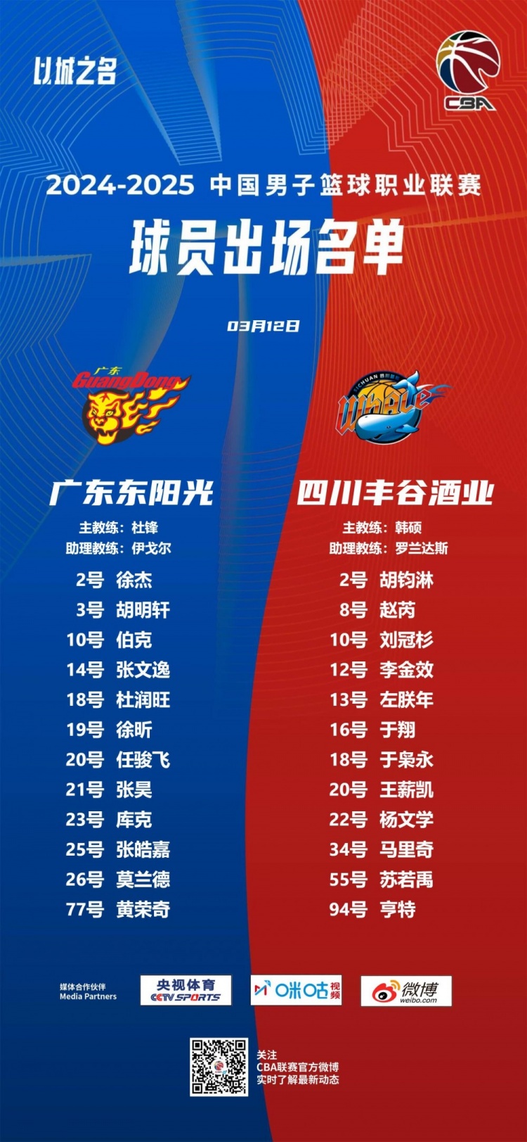3月12日訊 CBA常規(guī)賽,廣東主場(chǎng)對(duì)陣四川,賽前雙方公布了本場(chǎng)比賽的大名單。