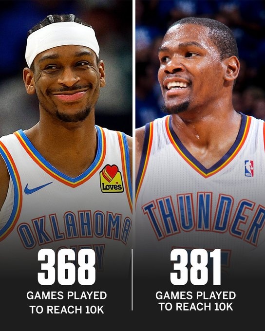 根據(jù)數(shù)據(jù)統(tǒng)計,亞歷山大歷時368場比賽解鎖雷霆生涯1萬分,他超越杜蘭特(381場),成為了隊史上(雷霆加超音速)解鎖1萬分最快的球員。