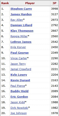 庫里達成4000記三分堪稱劃時代的成就,縱觀現(xiàn)役球員,僅少數(shù)幾位具備沖擊這一里程碑的理論可能性:
