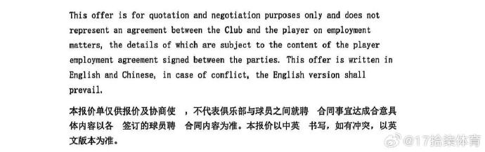 二 多家俱樂部對(duì)哈雷爾感興趣并進(jìn)行了談判,其間另一家中方經(jīng)紀(jì)公司在浙江稠州銀行俱樂部與哈雷爾的談判過(guò)程中簽訂了一份報(bào)價(jià)單,其中明確約定“該報(bào)價(jià)單僅供報(bào)價(jià)和協(xié)商使用,不代表球員與俱樂部完成聘用合同簽約。”——這也是浙江稠州銀行俱樂部多次公告中含糊其辭提及的“簽約”。最后,在多家俱樂部中談判協(xié)商中球員哈雷爾于二月十日選擇了簽約新疆廣匯俱樂部,三方按中國(guó)籃協(xié)和CBA公司要求簽訂了標(biāo)準(zhǔn)合同并在中國(guó)籃協(xié)完成了經(jīng)紀(jì)人備案。