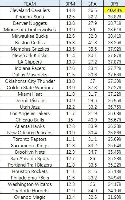 在騎士隊(duì)本賽季累計(jì)登場(chǎng)超過500分鐘的球員中,除了完全沒籃的阿倫和本賽季反復(fù)受傷的迪安-韋德,騎士隊(duì)三分命中率最低的球員是36.9%的莫布里,4名球員三分命中率超過40%,除了中鋒之外,所有球員都具備接球投籃的能力。