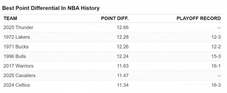 (圖為NBA歷史上的最高凈勝分紀錄,第一列為球隊,第二列為場均凈勝分,第三列為季后賽戰(zhàn)績)