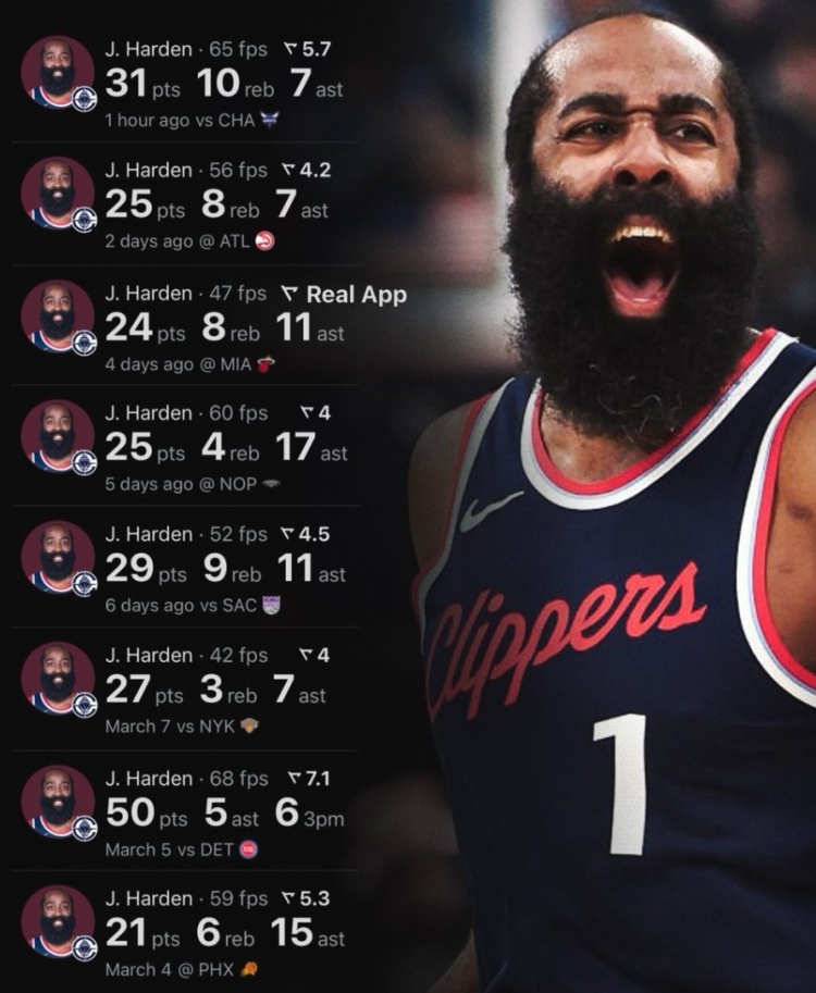 近八場(chǎng)比賽,哈登場(chǎng)均29分6.6籃板10.1助攻。