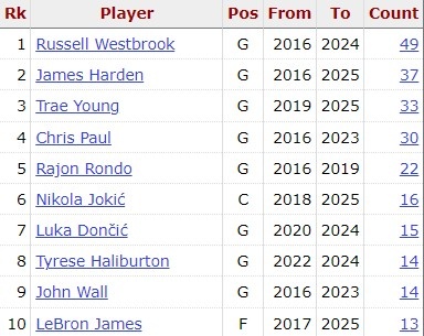 威少過(guò)去10個(gè)賽季50次半場(chǎng)助攻上雙 同期最多 哈登37次第二