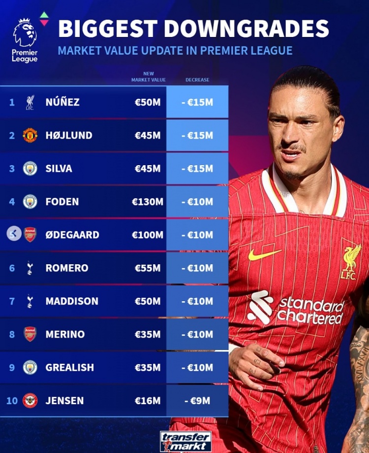 英超球員貶值榜:努涅斯&霍伊倫&B席均降1500萬,福登&厄德高在列