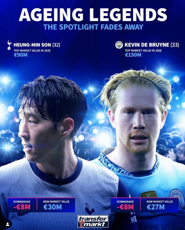 32歲孫興慜&33歲德布勞內(nèi)身價(jià)各降800萬歐,巔峰身價(jià)9千萬&1.5億