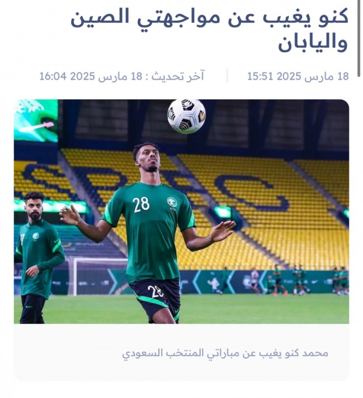 沙特媒體:沙特國腳中場穆罕默德-卡努因傷缺席對陣中國、日本