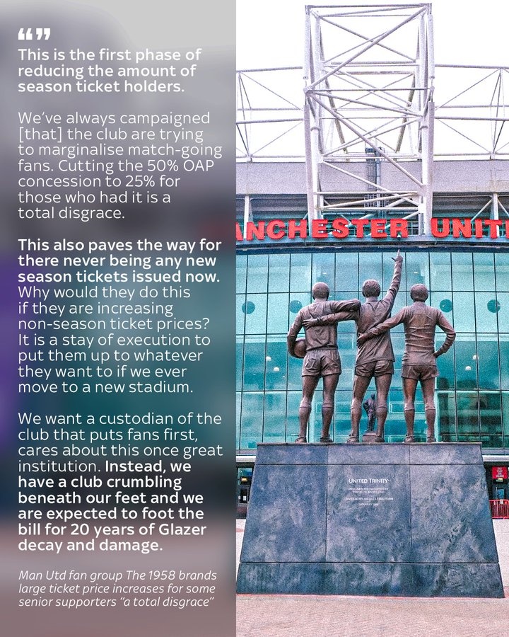 the 1958表示:“這是減少季票持有者數(shù)量的第一階段,我們一直反對俱樂部將球迷邊緣化的做法。將原有的50%的優(yōu)惠削減至25%,這完全是一種恥辱。”
