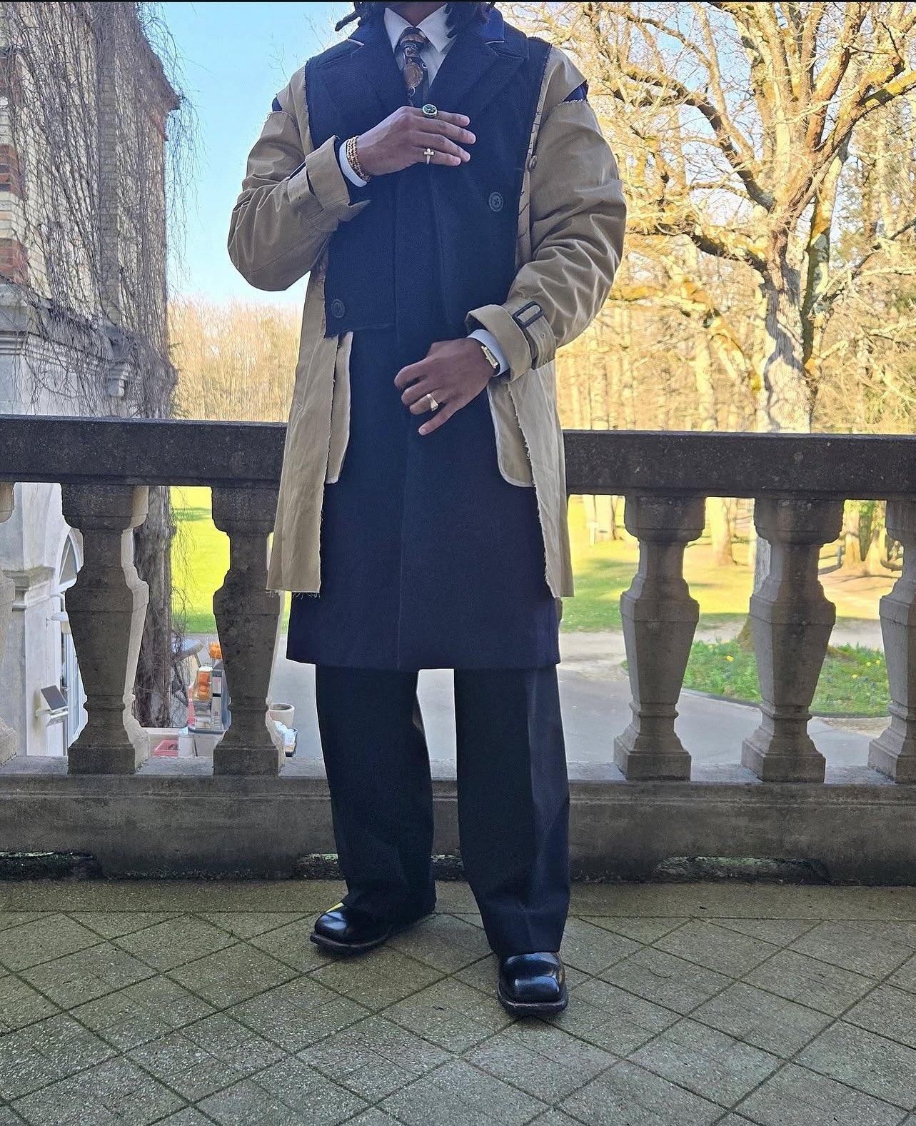 這一次孔德的穿搭中,最引人注目的就是他身上的拼接外套,這件大衣來自日本小眾設(shè)計(jì)師品牌FACETASM,是2022-23的秋冬系列中的一件。