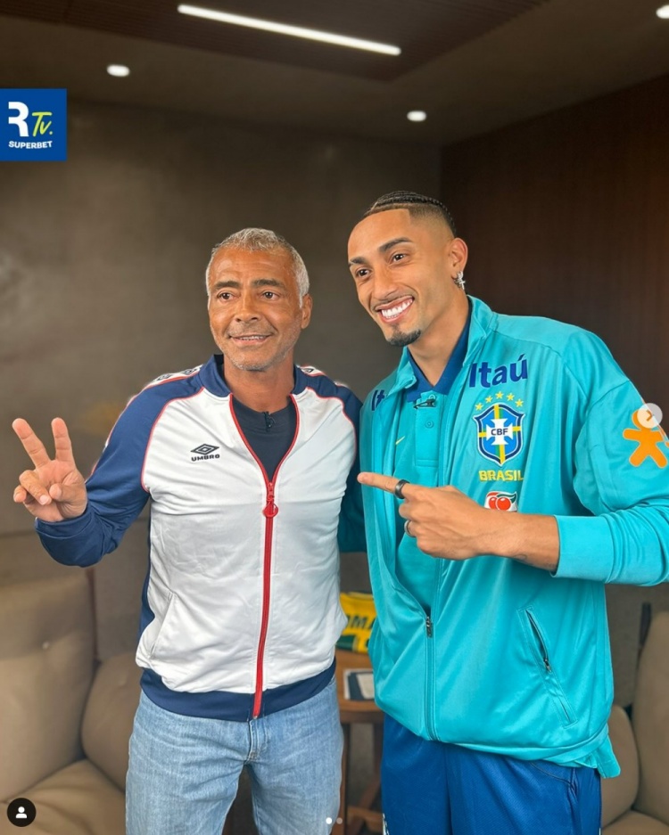 3月19日訊 巴西國家隊已經(jīng)集結備戰(zhàn)新一輪南美世預賽,羅德里戈、拉菲尼亞以及恩德里克三人做客Roma?rioTV節(jié)目,與巴西傳奇球星羅馬里奧合影留念。