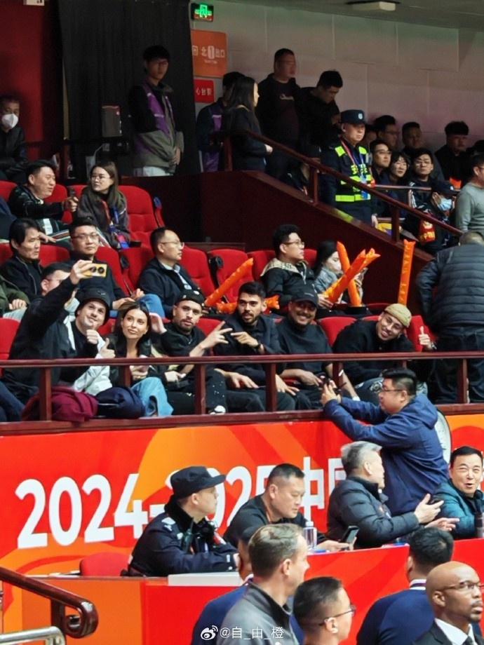 泰山隊博主“自_由_橙”曬出圖片,泰山外援克雷桑、馬德魯加、瓦科、卡扎爾現場觀戰(zhàn)CBA山東高速的主場比賽。