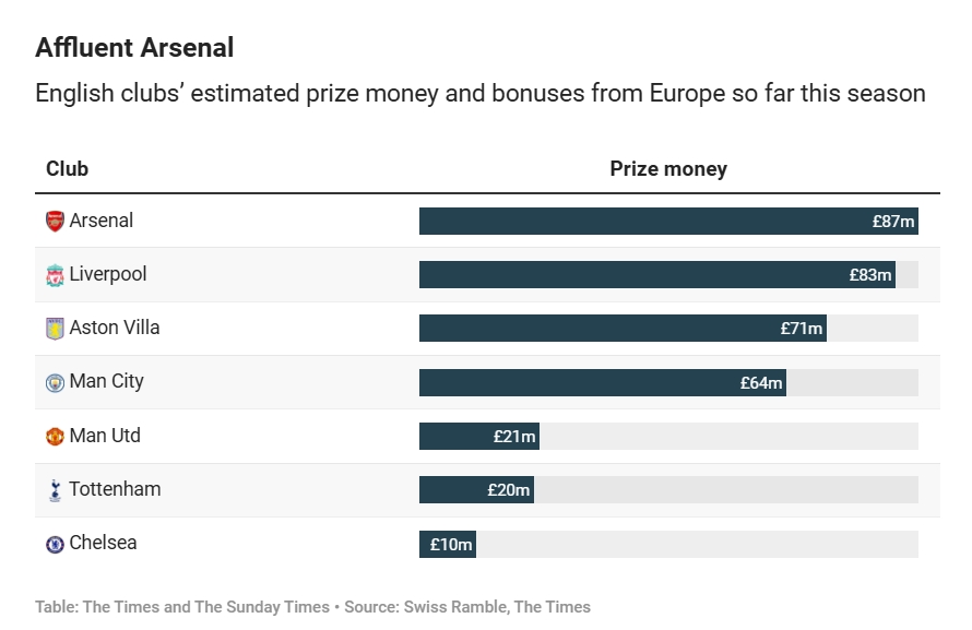 本賽季歐足聯(lián)調(diào)整了歐戰(zhàn)收入分配體系,使賽季期間的表現(xiàn)獲得更多經(jīng)濟(jì)回報(bào)而非依賴歷史成績(jī)。與上賽季相比,歐冠的總獎(jiǎng)金池增加了20%以上,歐足聯(lián)為比賽勝利、小組賽階段積分榜排名以及晉級(jí)淘汰賽提供了比例更高的獎(jiǎng)金。而基于俱樂(lè)部歷史表現(xiàn)計(jì)算的歐足聯(lián)系數(shù)排名所占的獎(jiǎng)金比例減少。例如,曼城未能進(jìn)入淘汰賽階段,其預(yù)計(jì)收入約為6400萬(wàn)英鎊;而阿斯頓維拉晉級(jí)四分之一決賽后至少賺了7100萬(wàn)英鎊。