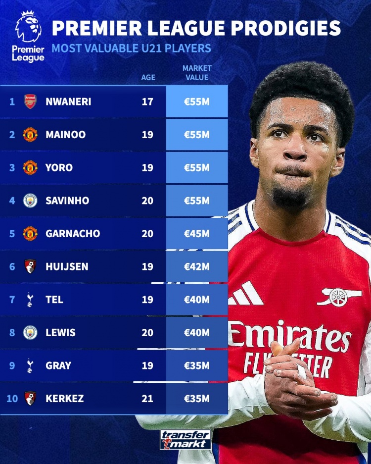 英超U21德轉(zhuǎn)身價(jià):恩瓦內(nèi)里、梅努、約羅、薩維尼奧5500萬(wàn)歐最高
