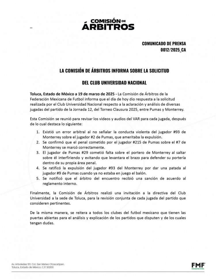 墨西哥美洲獅俱樂部賽后提出申請(qǐng),希望墨西哥裁判委員會(huì)對(duì)比賽中的判罰做出澄清和分析,裁判委員會(huì)發(fā)布公告,確認(rèn)當(dāng)值主裁存在失誤,拉莫斯上半場肘擊對(duì)手就應(yīng)該被罰下,但裁判沒有對(duì)其出示紅牌。