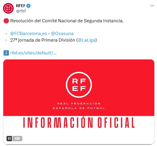 補(bǔ)賽仍在3月27日進(jìn)行!官方:巴薩與奧薩蘇納的上訴被駁回