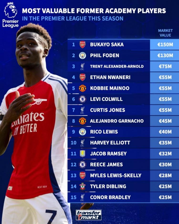 本賽季英超出自球隊(duì)青訓(xùn)球員身價(jià)榜:薩卡居首,福登&阿諾德在列