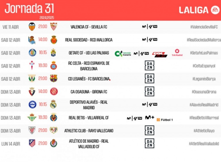 西甲31輪時(shí)間:4月13日3點(diǎn)萊加內(nèi)斯vs巴薩,22:15阿拉維斯vs皇馬