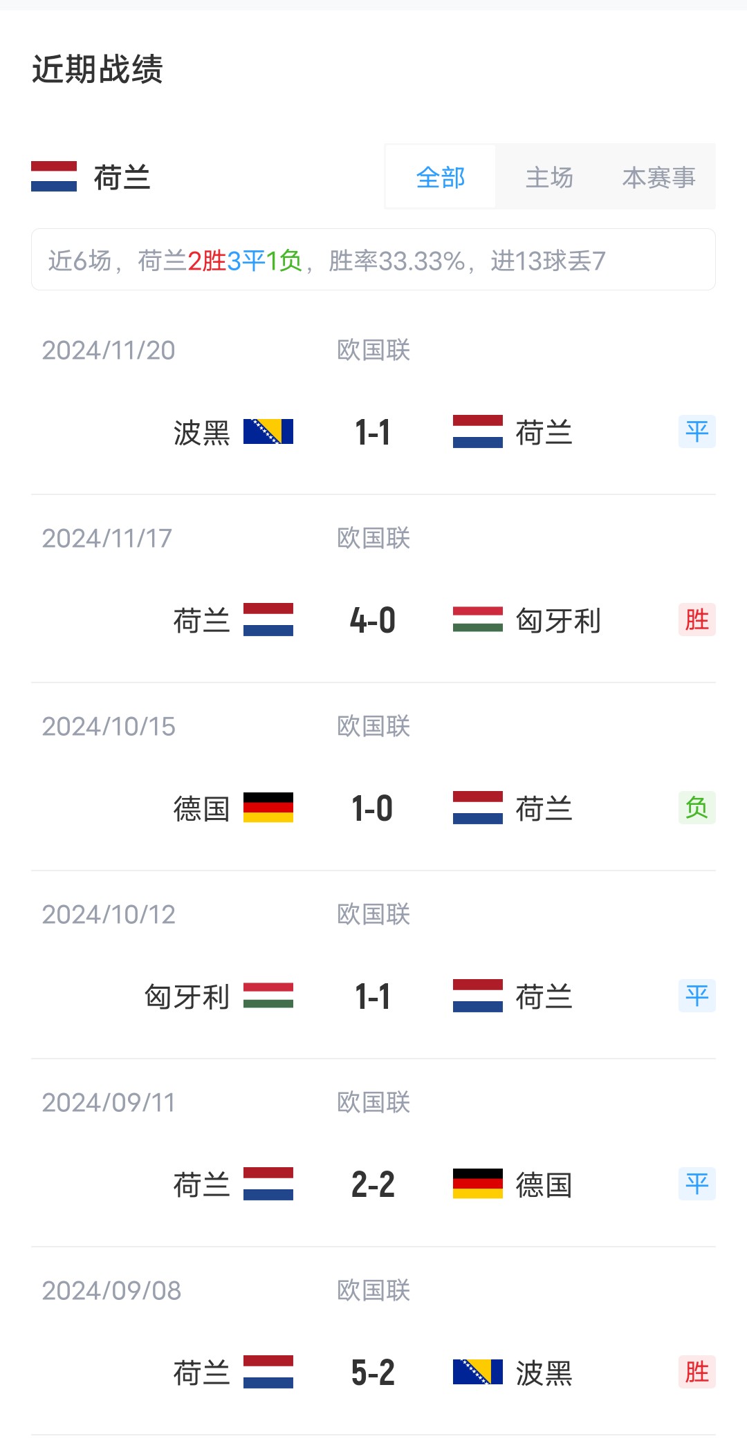 雙方近4場(chǎng)交鋒,荷蘭取得2勝2平的戰(zhàn)績(jī)稍居上風(fēng)。